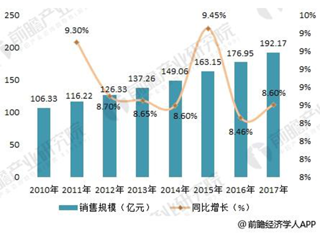 前瞻產(chǎn)業(yè)研究院發(fā)布的《2018-2023年中國(guó)低壓配電柜行業(yè)發(fā)展前景與投資預(yù)測(cè)分析報(bào)告》數(shù)據(jù)顯示,2010-2017年,我國(guó)低壓配電柜行業(yè)銷(xiāo)售額增長(zhǎng)基本維持在8.4%以上。近兩年,由于宏觀經(jīng)濟(jì)進(jìn)入新常態(tài)、電力投資增速不斷放緩等影響,低壓配電柜行業(yè)銷(xiāo)售規(guī)模增長(zhǎng)較為穩(wěn)定。2017年,低壓配電柜市場(chǎng)銷(xiāo)售規(guī)模約為192.17億元,同比增長(zhǎng)8.60%,僅較2016年提高了0.14個(gè)百分點(diǎn)。