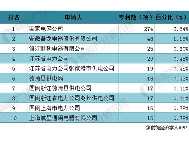 在專(zhuān)利技術(shù)申請(qǐng)人排名前十中,國(guó)家電網(wǎng)公司一家獨(dú)大,截至2018年5月底,申請(qǐng)專(zhuān)利達(dá)到274項(xiàng),占全國(guó)申請(qǐng)專(zhuān)利的6.54%;排在第二的安徽鑫龍電器股份有限公司專(zhuān)利申請(qǐng)量只有48項(xiàng),占比為1.15%;其他公司申請(qǐng)專(zhuān)利量不到30項(xiàng)。
