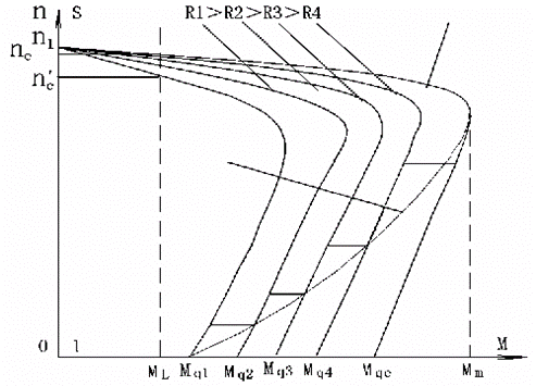 (2)圖中起動(dòng)曲線與橫軸交叉點(diǎn)(Mq1、Mq2、Mq3、Mq4、Mqe)為起動(dòng)初始電磁轉(zhuǎn)矩。ML為額定負(fù)載轉(zhuǎn)矩,對應(yīng)的轉(zhuǎn)速為電機(jī)額定轉(zhuǎn)速(Ne)。Mm為最大電磁轉(zhuǎn)矩。