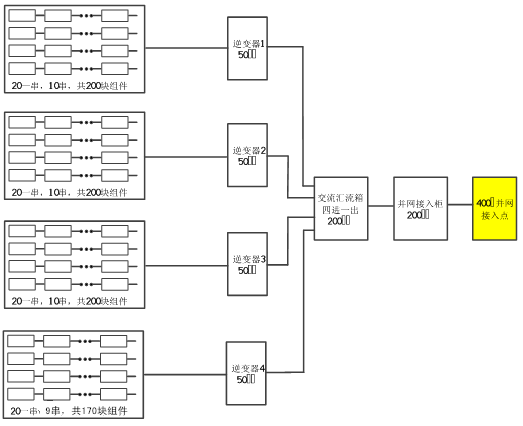交流匯流箱配置在水泥屋頂,滿足四進一出接入需求,出線通過交流電纜連接至在原有低壓配電室。