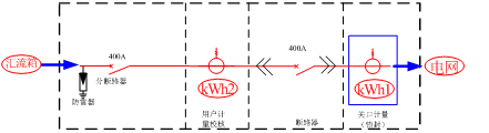 并網接入柜安裝在光伏發電的并網點,主要由主斷路器、分斷路器、電流互感器、測控表計、關口計量等設備組成。u 故障隔離功能,短路瞬時、長延時保護功能和欠壓脫扣功能u 光伏發電量計量功能u 關口計量設備鉛封功能u 具備防雷功能u 通訊接入、規約轉換功能u 帶電顯示功能u 柜體防護等級:IP20u 關口計量需鉛封u 根據用戶原柜體型式設計,600A一進一出交流配電柜電氣原理圖